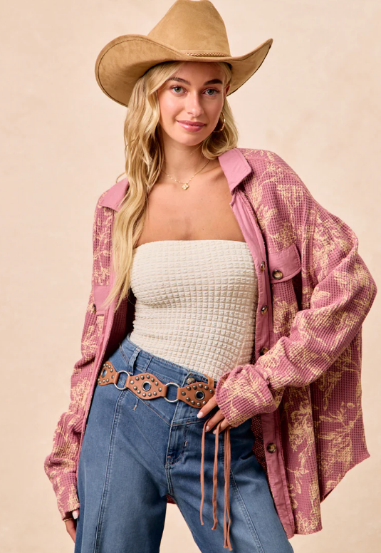B4 BiBi OVERSIZED Floral Waffle Thermal Shacket in Berry
