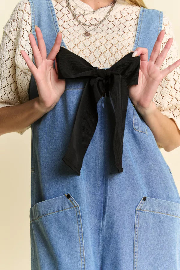 Lightweight Soft Denim Jumpsuit, complete with a playful bow detail. Perfect for a fun outing, this jumpsuit is ready to add a touch of whimsy to any wardrobe. Front zipper adds convenience without compromising on style.