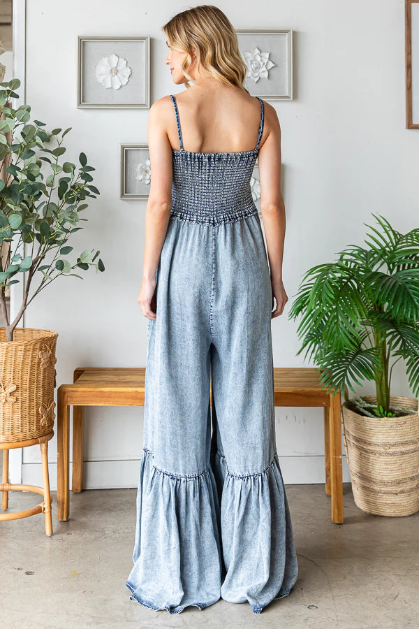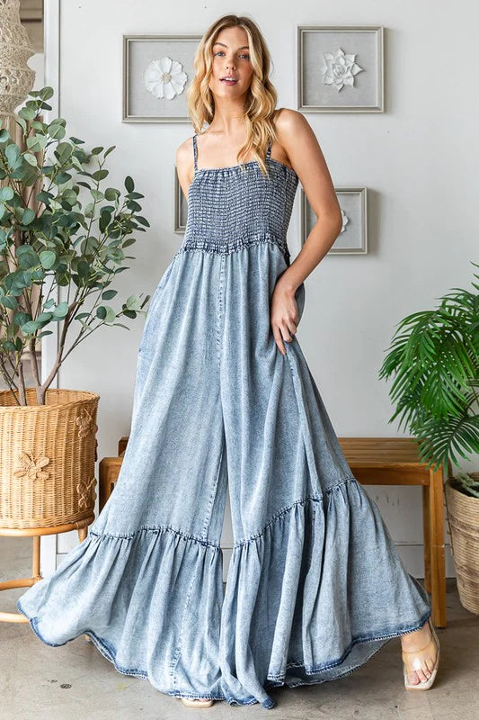 WASHED SMOCKED DETAIL RUFFLE WIDE LEG JUMPSUIT