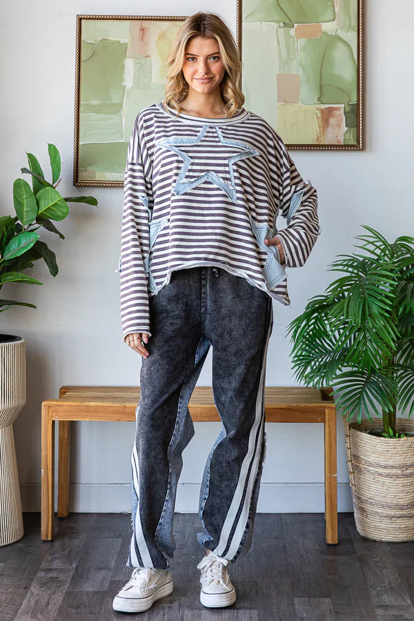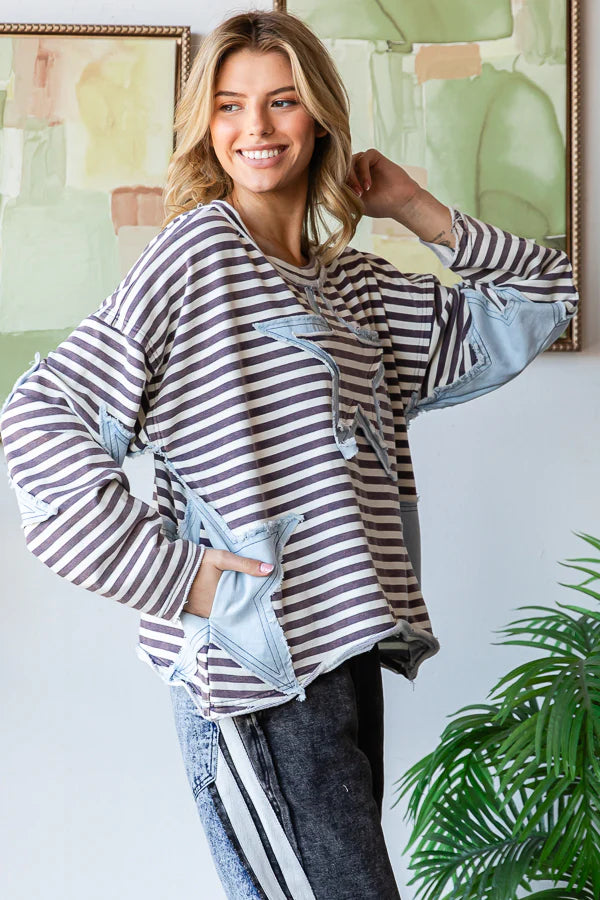 Be the fashion star in this denim star patchwork striped drop shoulder top.